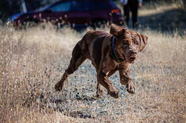 Un Catahoula Heeler courant sur un terrain herbeux et portant un collier autour du cou