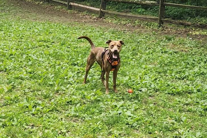 Un Catahoula Heeler sur une surface herbacée et portant un harnais