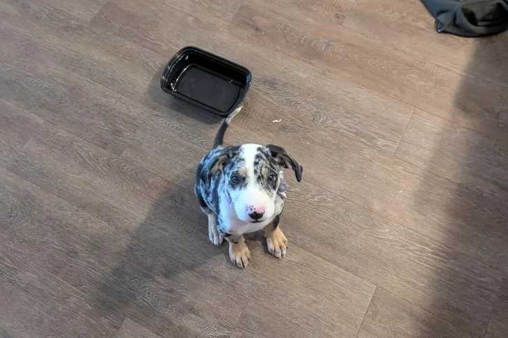Un Catahoula Heeler assis sur un plancher et regardant vers la caméra
