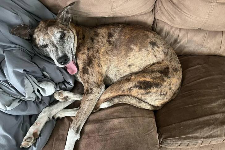 Un Catahoula Heeler allongé sur un canapé et regardant vers la caméra