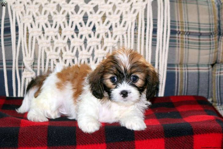Un Cava Tzu allongé sur une couverture à carreaux rouges et noirs avec un canapé en arrière-plan