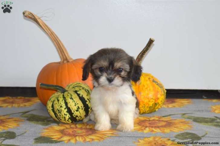 Un Cava Tzu assis à côté de plusieurs citrouilles sur un tapis à motifs