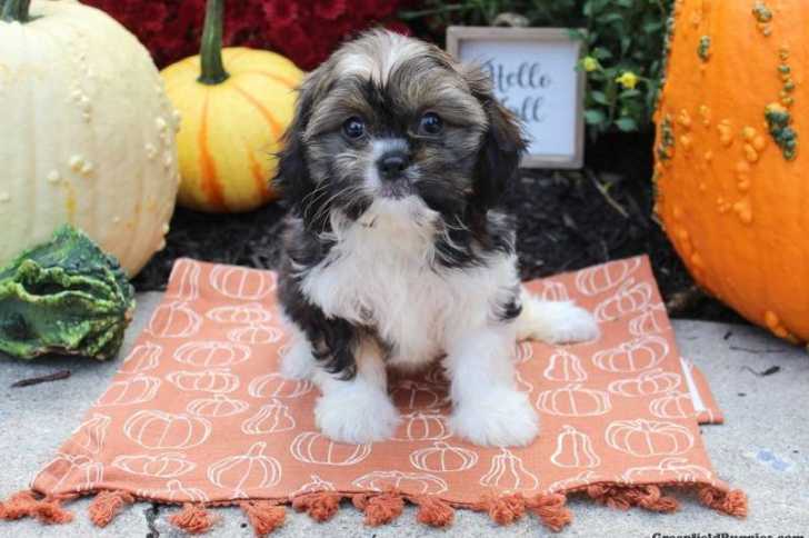 Un Cava Tzu assis sur un tapis orange avec des motifs de citrouilles