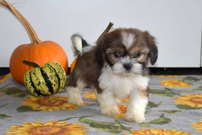 Un Cava Tzu se tenant à quatre pattes sur un tapis avec des motifs de tournesols