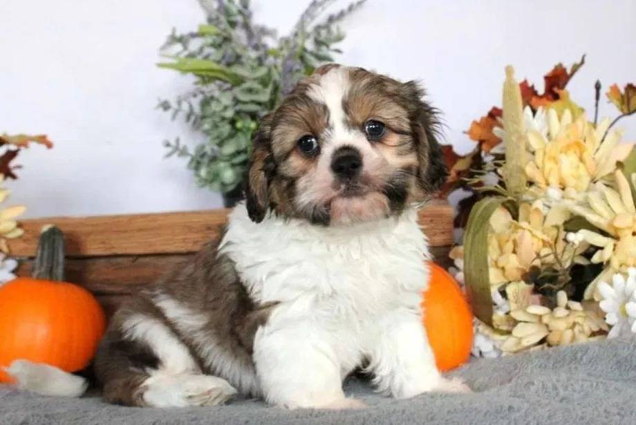 Un Cava Tzu faisant face à la caméra et assis sur un tissu gris