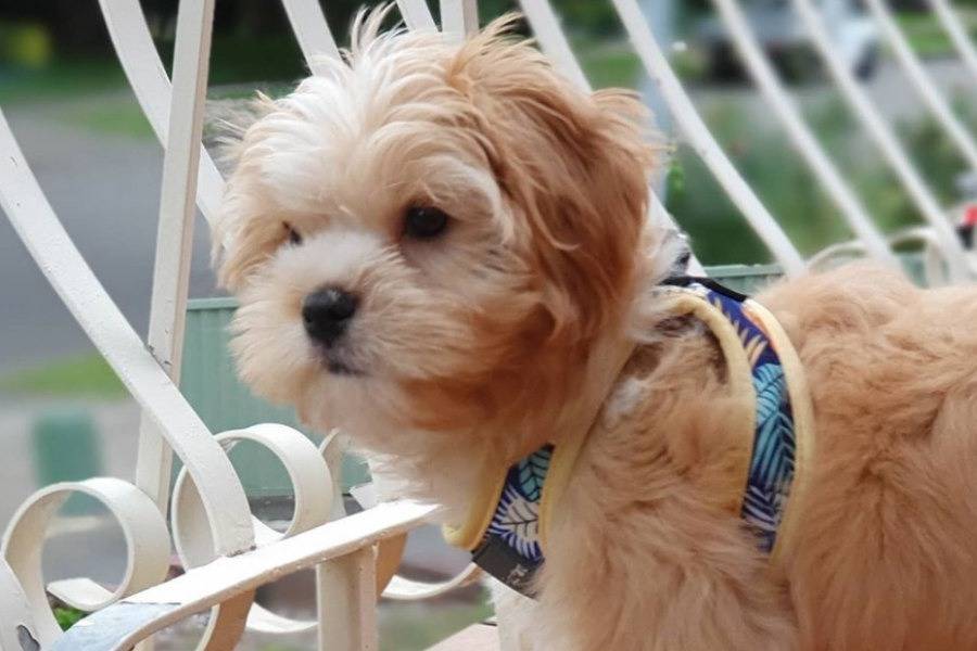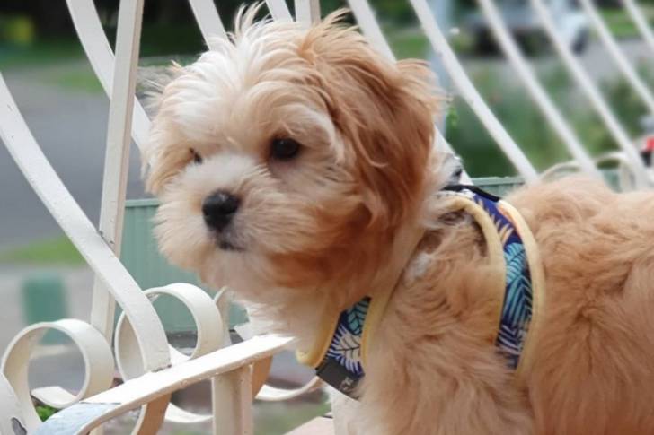 Un Cava Tzu portant un collier et regardant à travers une clôture blanche