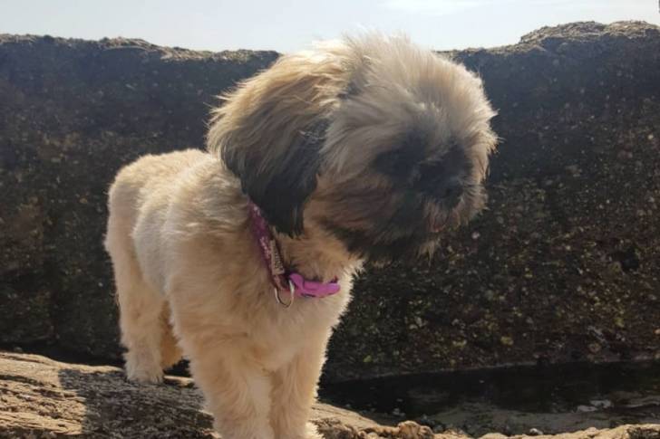 Un Cava Tzu portant un collier et se tenant sur une surface rocheuse