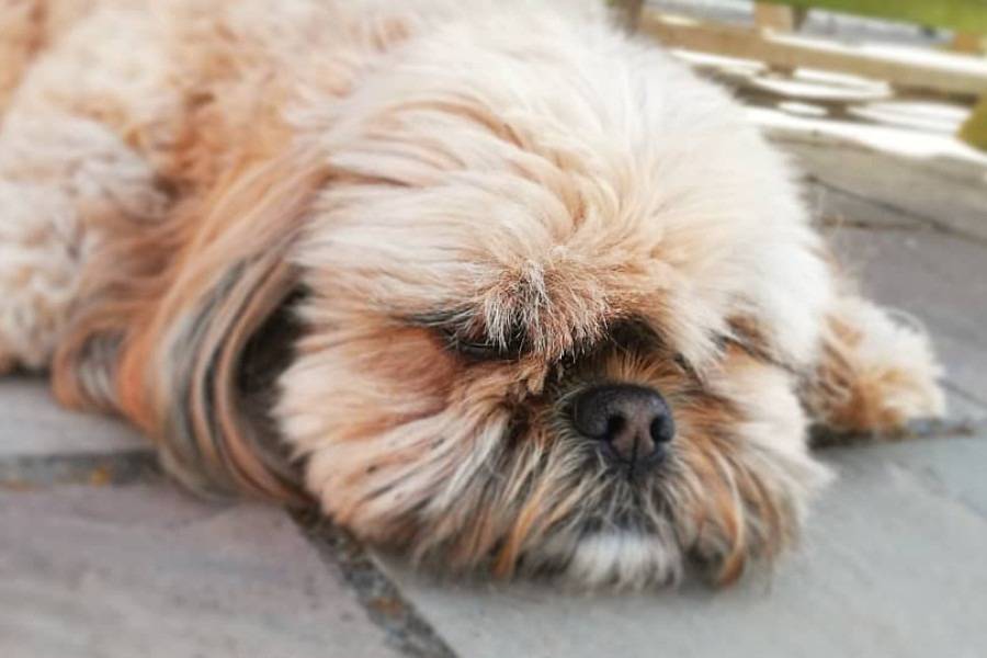 Un Cava Tzu au pelage bicolore allongé sur un sol pavé