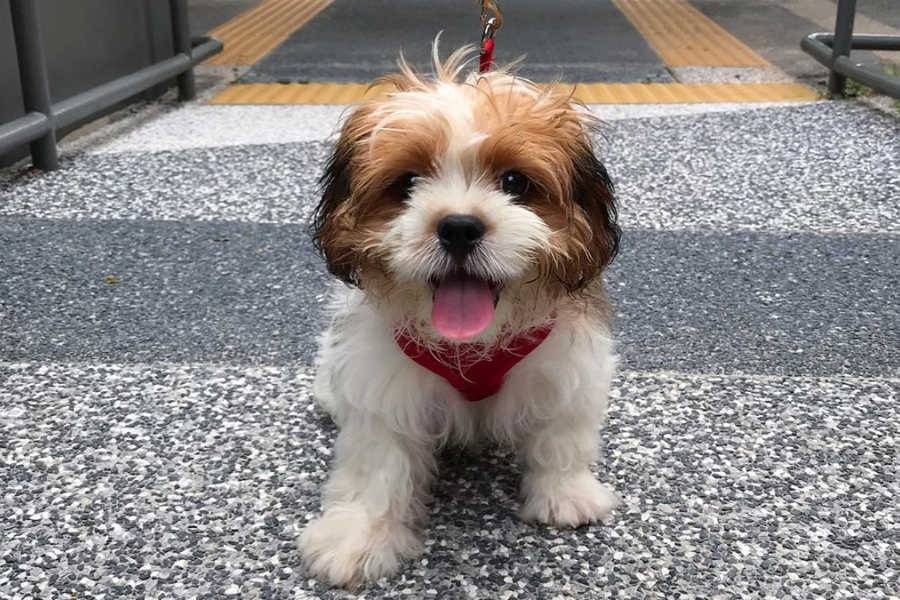 Un Cava Tzu portant un harnais et assis sur une surface pavée