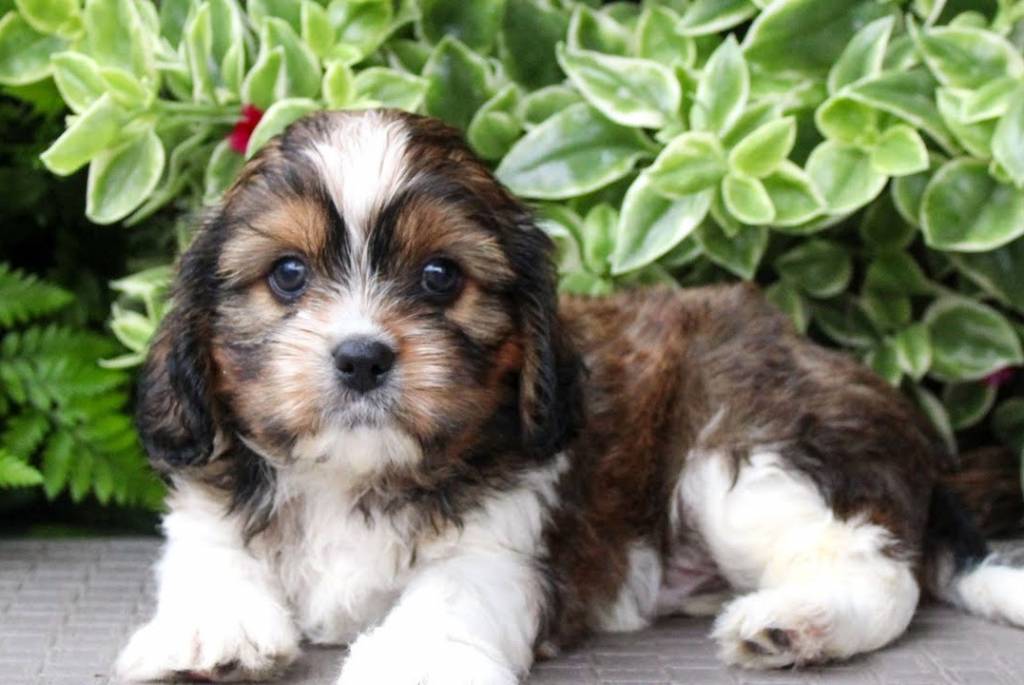 Un Cava Tzu assis au sol avec des fleurs en arrière plan