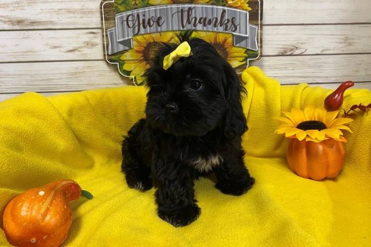 Un Cava Tzu assis sur une couverture jaune à côté d'une citrouille et d'un tournesol