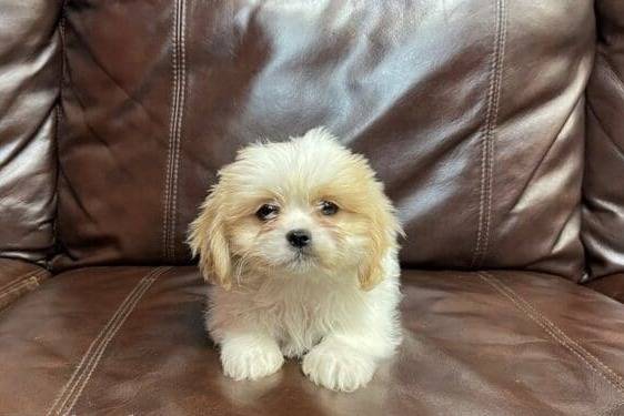 Un Cava Tzu blanc assis sur un canapé en cuir