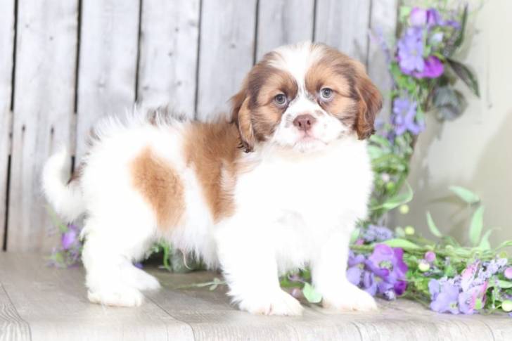 Un Cava Tzu debout sur une surface en bois et entouré de fleurs violettes