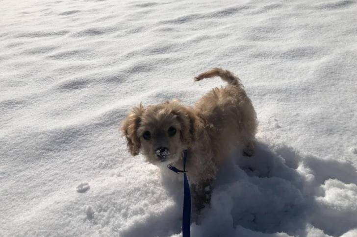 Un Cavachon sur une surface enneigée et qui est tenu en laisse