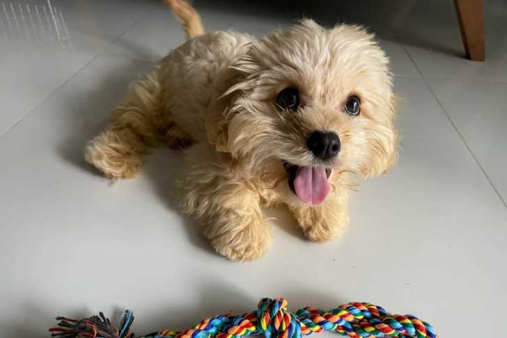Un Cavachon allongé sur un sol carrelé et tirant la langue