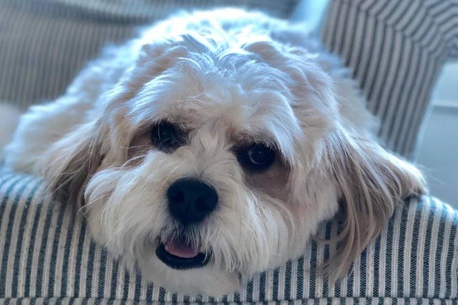 Un Cavachon allongé sur un canapé et regardant vers la caméra