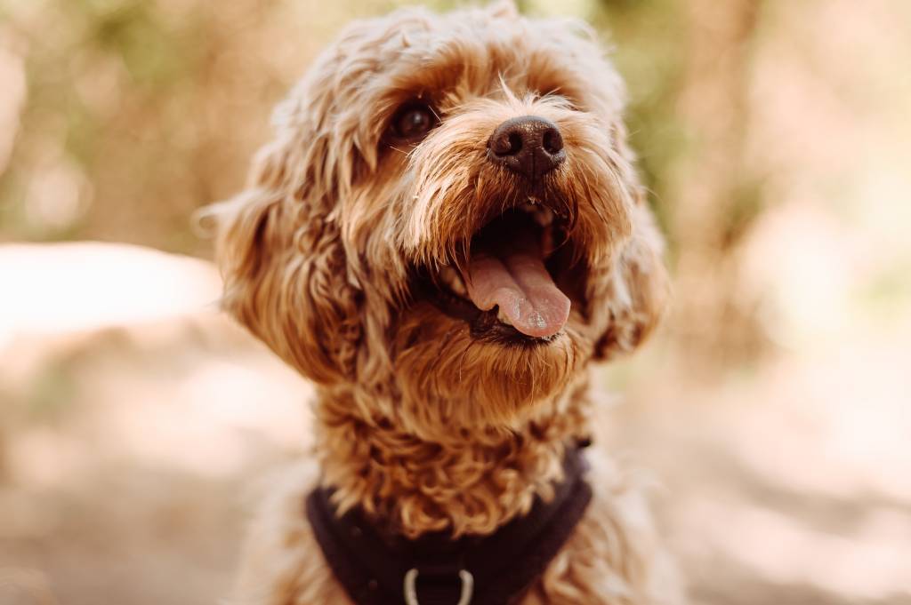 Un Cavapoo aux poils beiges portant un harnais noir et tirant la langue, la gueule ouverte.