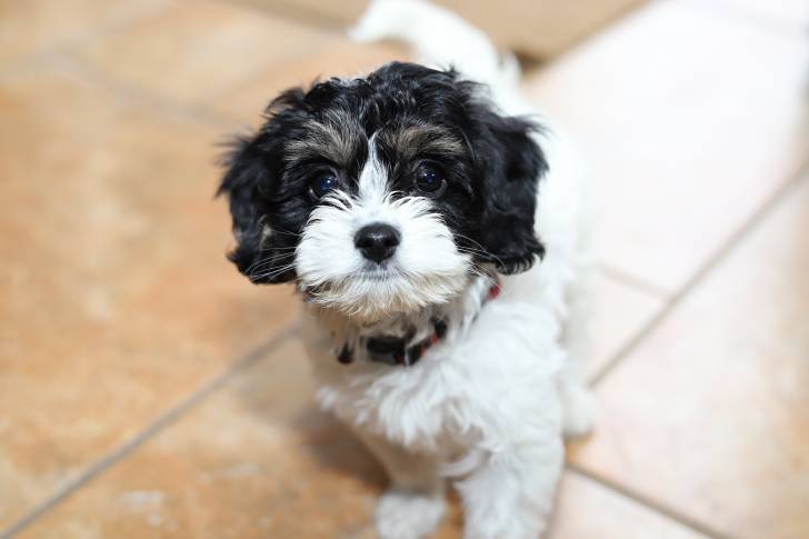 Un chiot Cavapoo au pelage blanc et noir qui se tient debout sur un carrelage orange