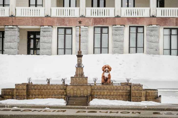 Un chien adulte Cavapoo debout sur un monument commémoratif entouré de neige