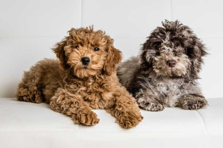 Deux chiens Cavapoo, un orange et un gris, allongés sur un canapé blanc