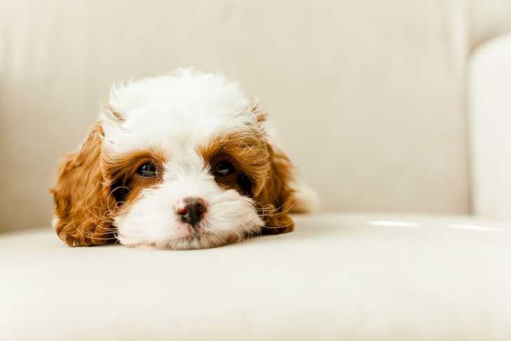 Un chiot Cavapoo allongé sur le ventre sur un canapé blanc et ayant l'air fatigué
