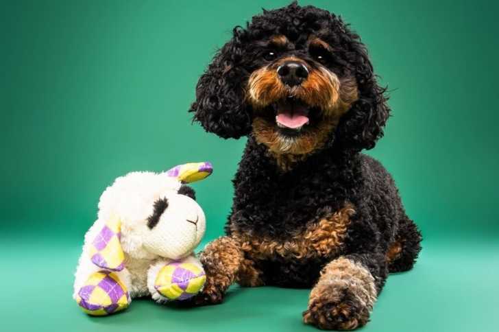 Un chiot Cavapoo aux poils noirs et orange, allongé sur un fond vert avec une peluche à ses côtés