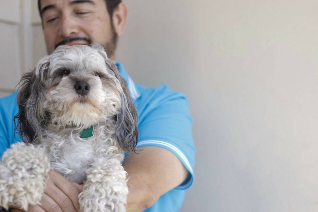 Un chien Cavapoo au pelage blanc et gris installé dans les bras de son maître