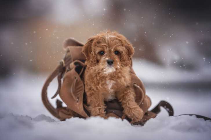 Un bébé Cavapoo au pelage orange, sortant d'un sac à dos posé sur la neige