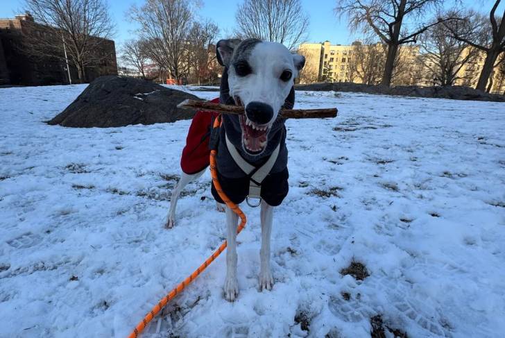 Un Chart Polski sur une surface enneigée tenant dans sa gueule un morceau de bois