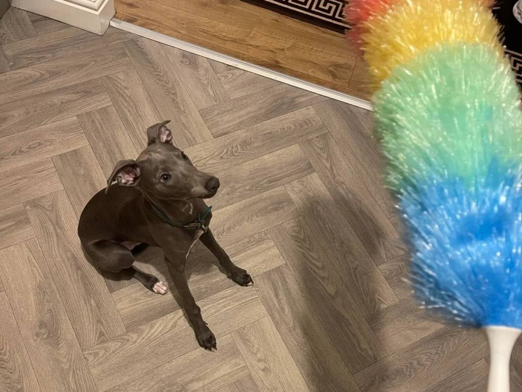 Un Chart Polski assis sur un parquet