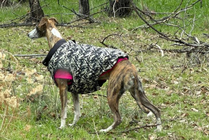 Un Chart Polski sur un terrain herbeux et portant un gilet