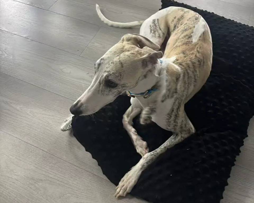 Un Chart Polski allongé sur un coussin et portant un collier autour du cou