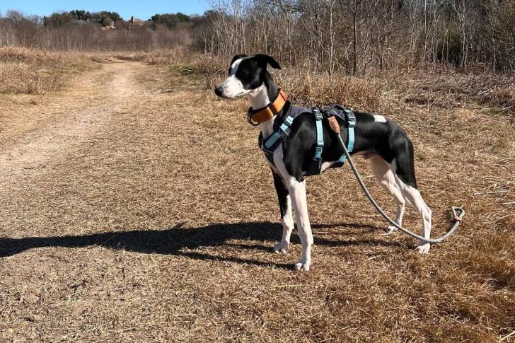 Un Chart Polski sur un terrain herbeux et portant un harnais