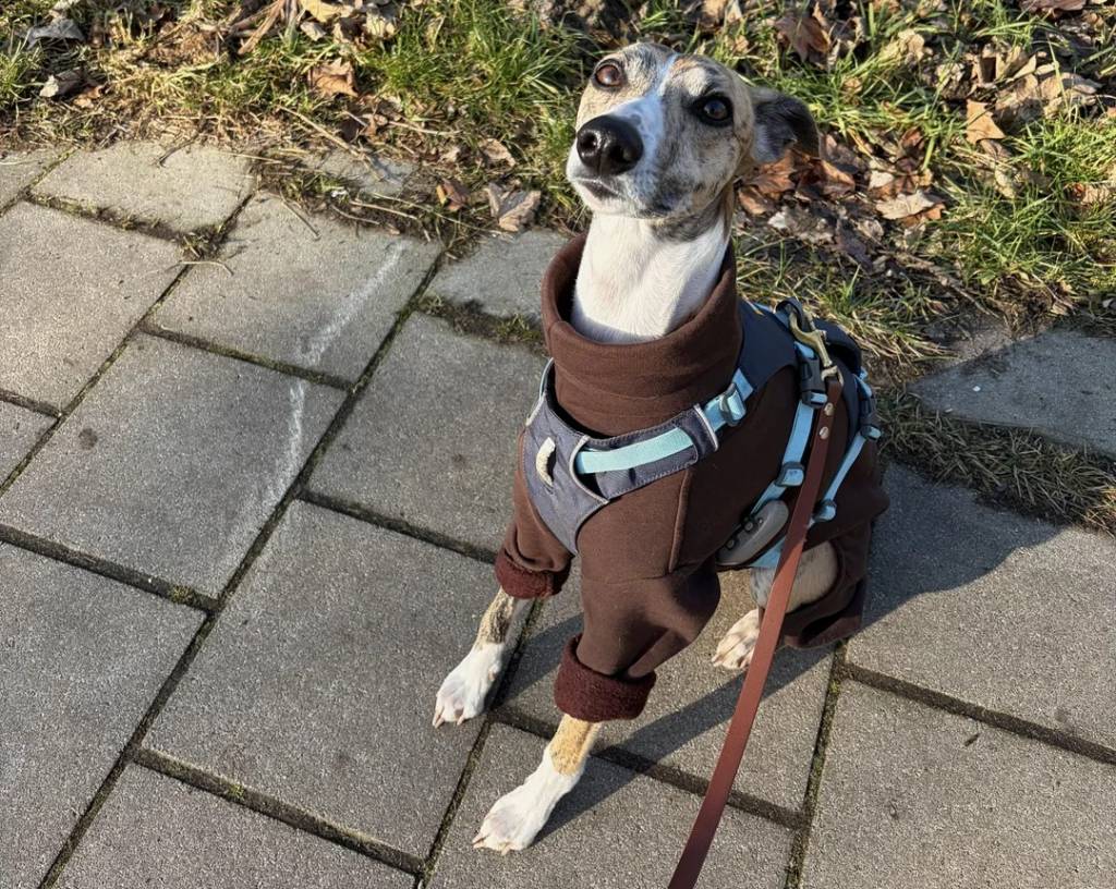 Un Chart Polski assis sur un sol pavé portant un harnais et tenu en laisse