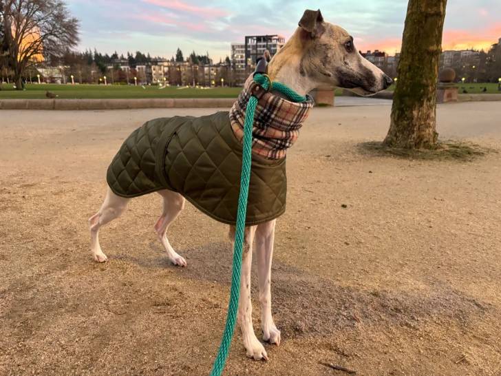 Un Chart Polski tenu en laisse dans un parc et portant un gilet