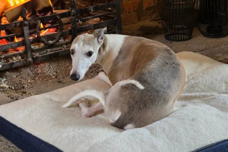 Un Chart Polski allongé sur un panier poilu