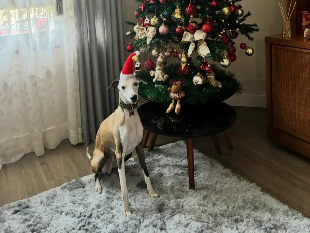 Un Chart Polski assis à côté d'un sapin