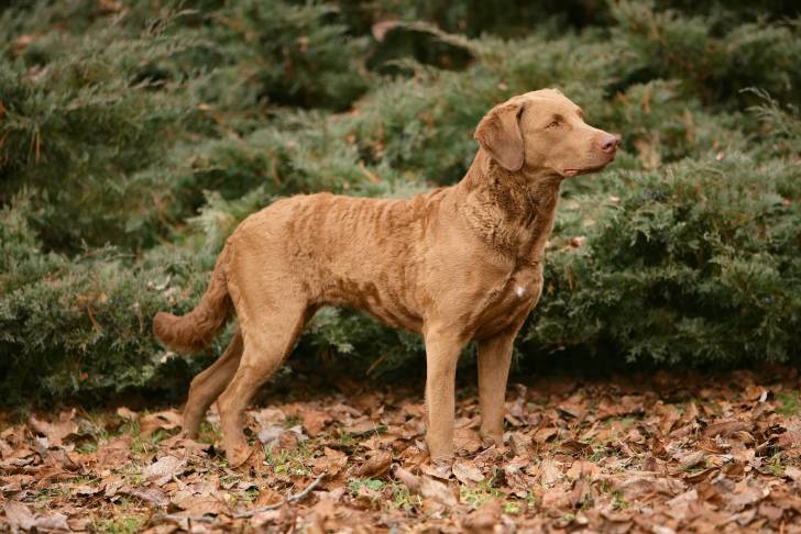 Un Chesapeake Bay Retriever brun dans une forêt