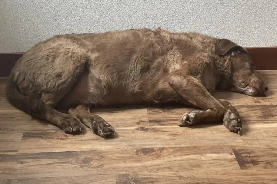 Un Chesapeake Bay Retriever allongé sur un plancher et semblant dormir