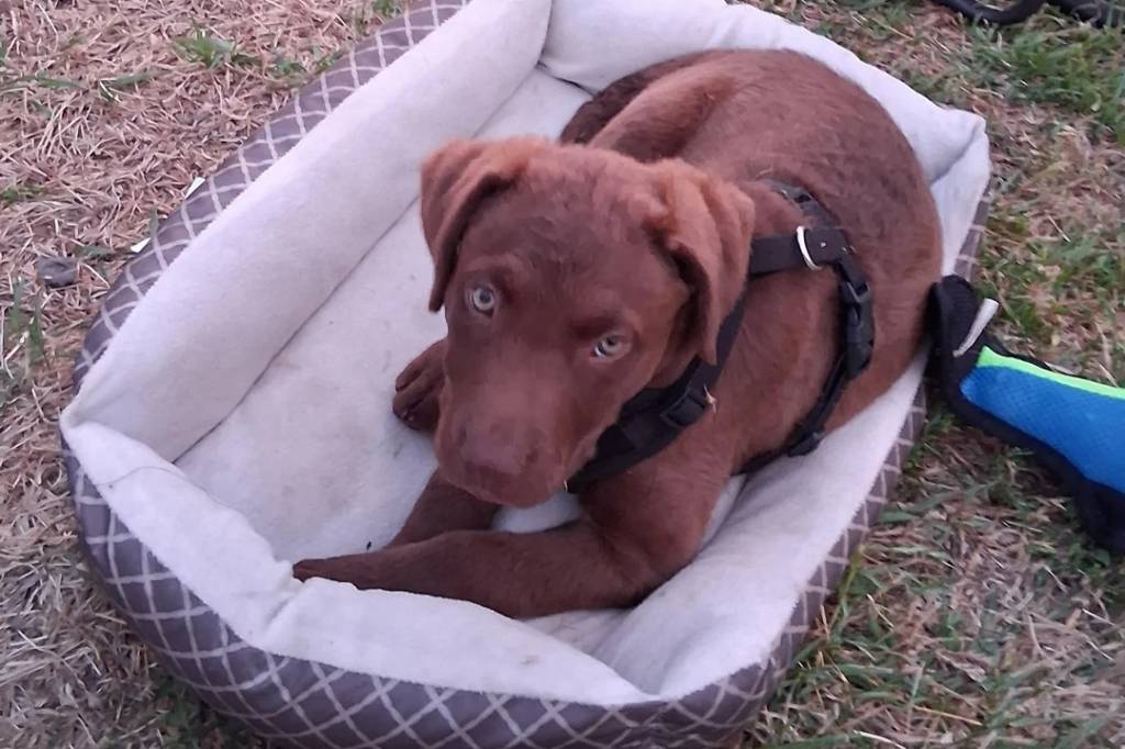 Un Chesapeake Bay Retriever allongé dans un panier et portant un harnais