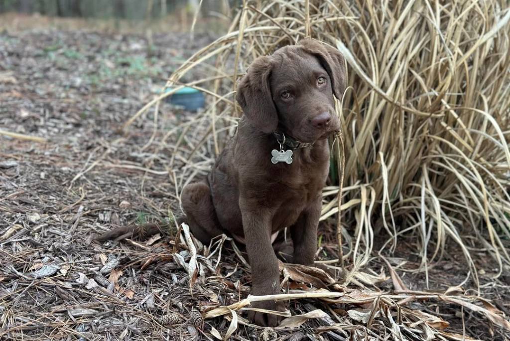 Un chiot Chesapeake Bay Retriever assis sur un terrain herbeux et portant un collier autour du cou