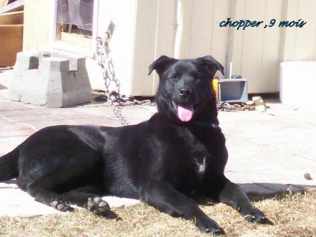 voici chopper, sur cette photo il a 9 mois. c un gentil labernois croisé labrador . y'a rien qu'il aime plus que de se faire coller, tellement que des fois, c un peu tannant!!! hihi