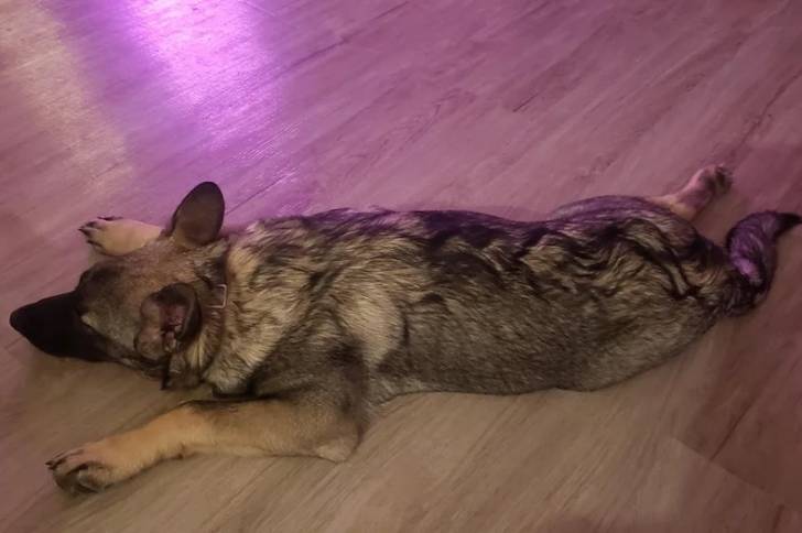 Un Chien d'Élan Norvégien Gris allongé sur un plancher et semblant détendu