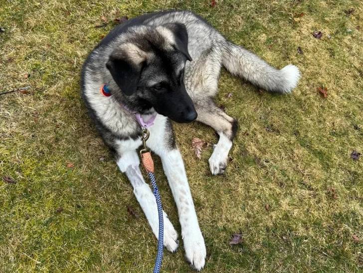 Un Chien d'Élan Norvégien Gris allongé sur une surface herbacée et qui est tenu en laisse