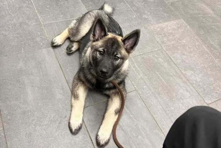 Un Chien d'Élan Norvégien Gris allongé sur un sol carrelé et qui est tenu en laisse