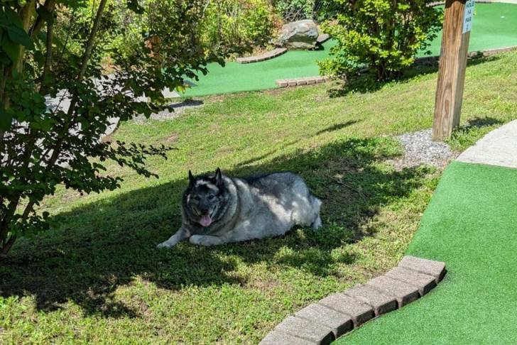 Un Chien d'Élan Norvégien Gris allongé sur une surface gazonnée et tirant la langue