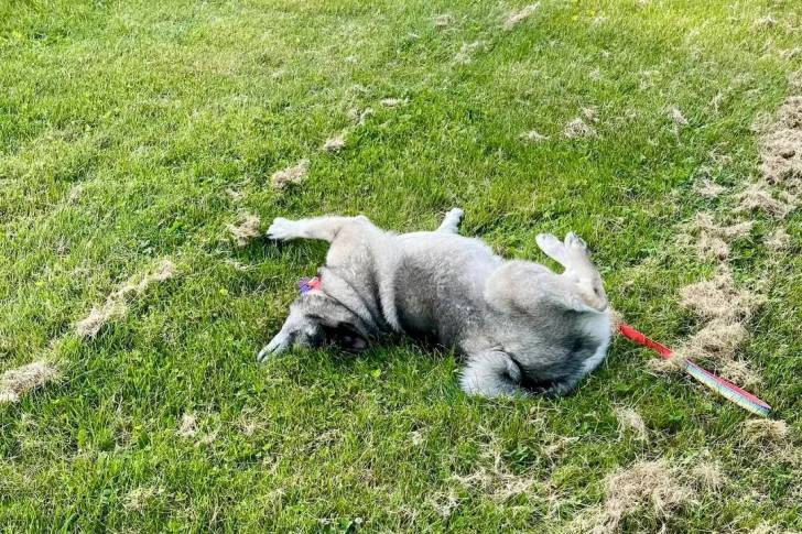 Un Chien d'Élan Norvégien Gris allongé sur une surface herbacée et portant un collier autour du cou