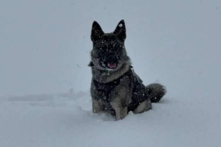 Un Chien d'Élan Norvégien Gris assis sur une surface enneigée et portant un harnais