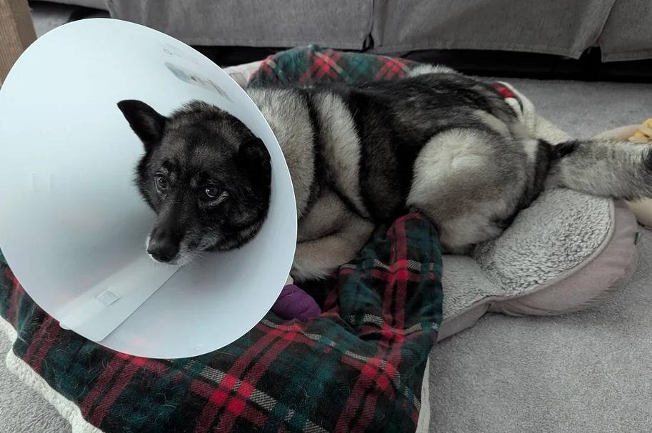Un Chien d'Élan Norvégien Gris allongé et portant un carcan