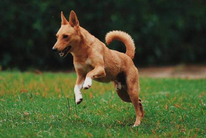 Un Chien de Canaan essaie de pêcher dans un bassin